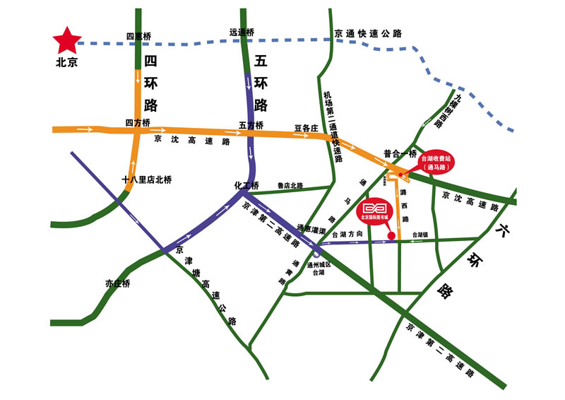 自东长安街延长路驶入东五环--进京津高速路--从京津高速第一个出口(台湖)